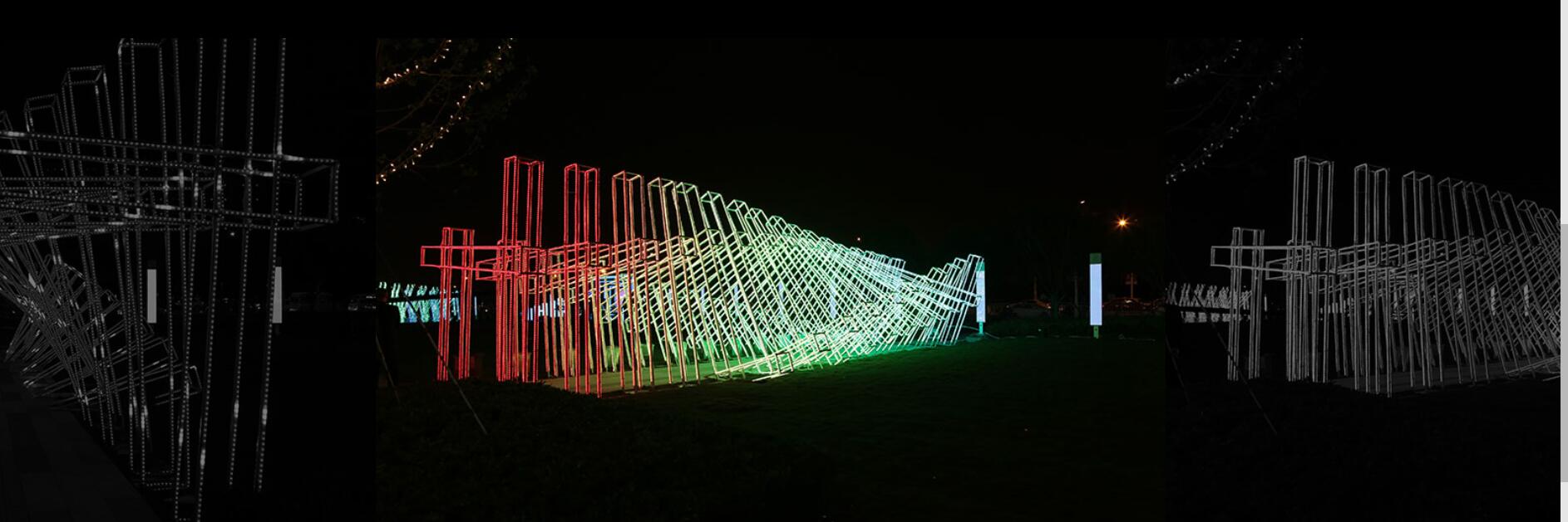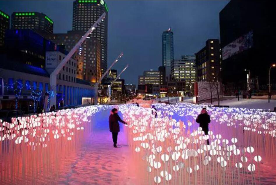 该项目的设计是从魁北克的麦田里得到灵感的,当小麦迎着微风左右摆动时,景色尤其美丽。由麦田浮动而生的Entre les rangs装置是由成千个灵活柔韧的茎管组成,管状结构顶部附有一个白色的反光膜,这些反光膜利用周围的景观刺激可以不断移动变换,充满活力与动感。